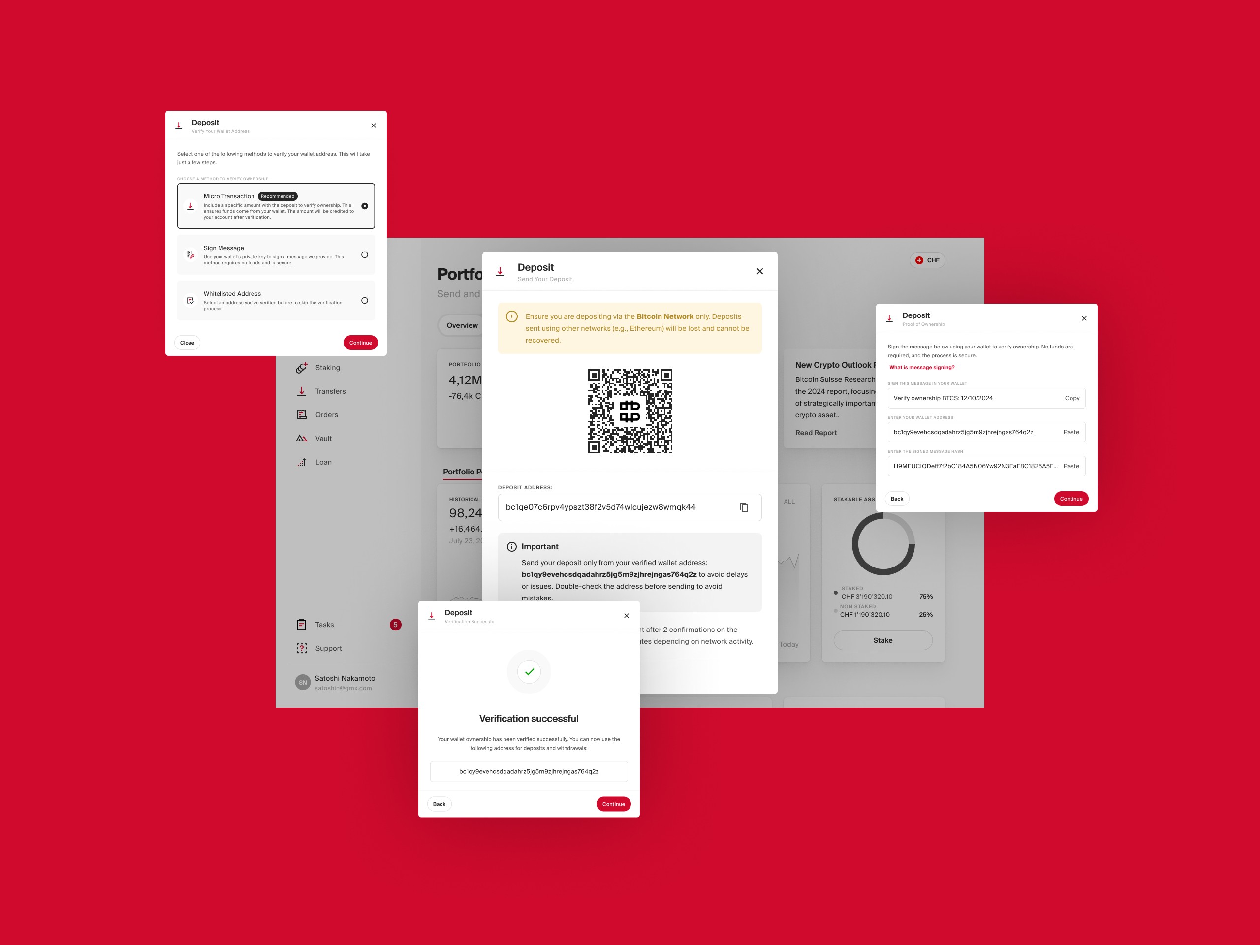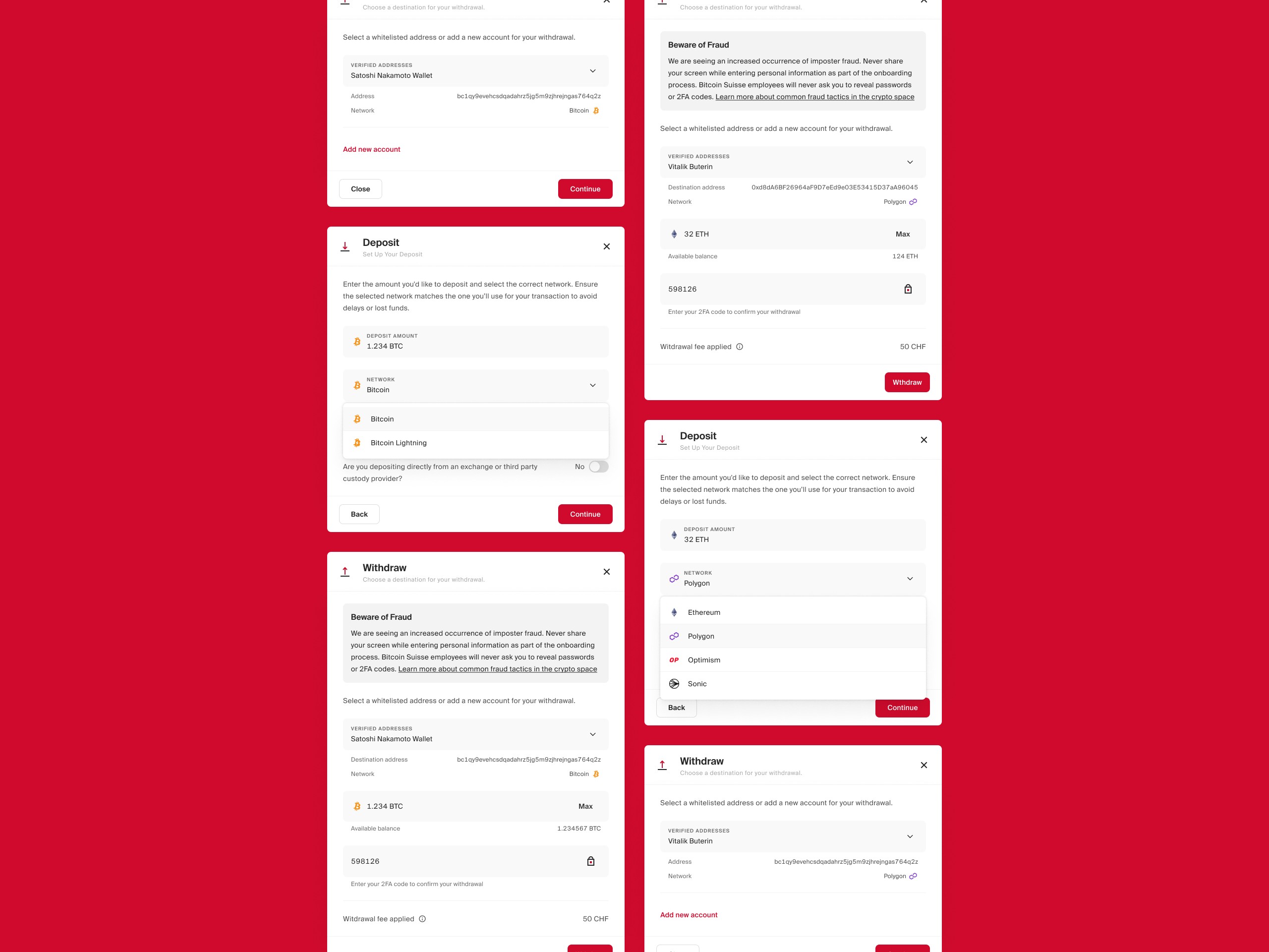 Working at Bitcoin Suisse means designing for high stakes - users manage real money, and trust is everything. Every decision had to balance usability with clarity, especially in flows involving crypto networks, wallet security, and time-critical trades.
